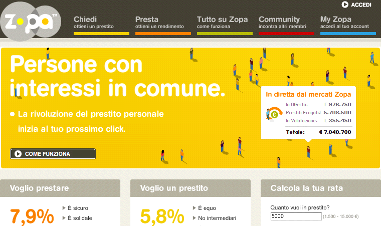 Ecco la sua storia: Zopa nasce in Gran Bretagna e identifica un servizio di social lending, ovvero di prestito di denaro on line senza l’intermediazione di banche e società finanziarie. I vantaggi per chi richiede il prestito ed anche per chi lo concede sono rilevanti in termini di tassi ed interessi, tanto che il servizio e la community di aderenti è in forte crescita.