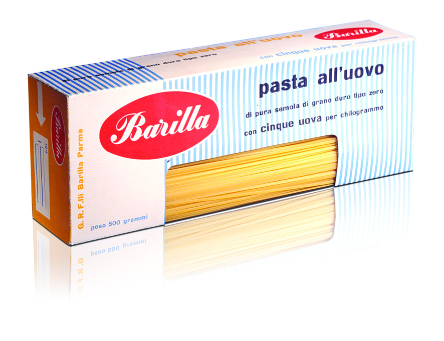 Ecco una bellissima immagine della confezione degli spaghetti Barilla del 1955, ancora lontana dal blu intenso che chiunque ricorda ed attribuisce alla marca, e con un logo differente rispetto a quello attuale. Il brand name Barilla è invece … stabile, e se è vero che nomen est omen, con Barilla se ne ha una smagliante conferma. Il cognome Barilla deriva infatti da barile, un recipiente simile ad una piccola botte impiegato per la conservazione di prodotti liquidi o in polvere, come la farina. Ed allora nel 1875 Pietro Barilla segue il suo destino ed apre una bottega di fornaio dentro i bastioni di Parma, dando inizio ad una bellissima storia italiana.