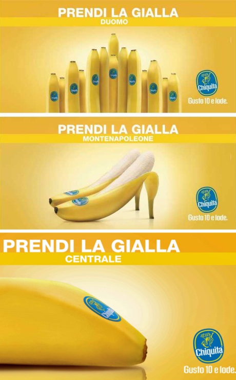 E’ primavera e fioccano le banane. Di forte impatto e molto ricca di contenuto è la nuova campagna milanese di Chiquita: un bel gioco linguistico che prende avvio dall’espressione colloquiale “prendo la gialla” intendendo che ci si muove con la linea metropolitana gialla. In questo caso però “la gialla” è la banana Chiquita, e la frase è una sorta di imperativo o di invito. In aggiunta, la banana diventa icona di una stazione metropolitana della linea gialla, connotandola fortemente: Duomo – la banana rappresenta l’edificio, Montenapoleone – la gagliarda banana diventa una scarpa scollata con il tacco, Centrale – la banana diventa una Freccia Gialla!