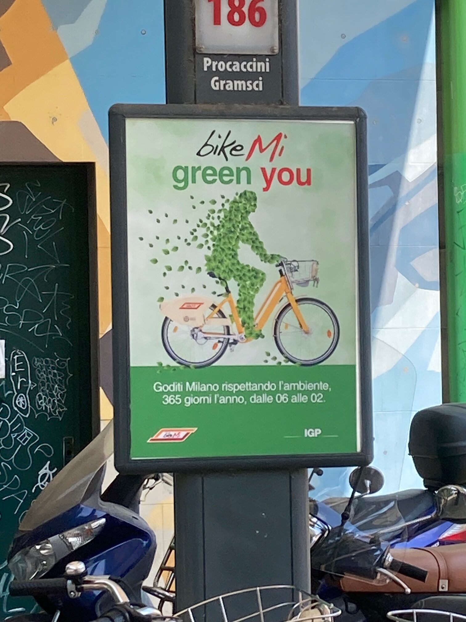 Finora ho visto 3 soggetti, ma è un tema declinabile all’infinito e me ne aspetto altri, altrettanto simpatici e intriganti. Il nome del servizio di ATM di bike sharing BikeMi dà il la, e la lingua inglese replica. E così fioriscono espressioni che ricalcano la struttura Bike+Mi, in una simmetria goliardica dove verbi e aggettivi che diventano verbi, si accoppiano con il pronome you. Nasce una specie di botta e risposta: se bikemi, allora free you, fast you, green you.