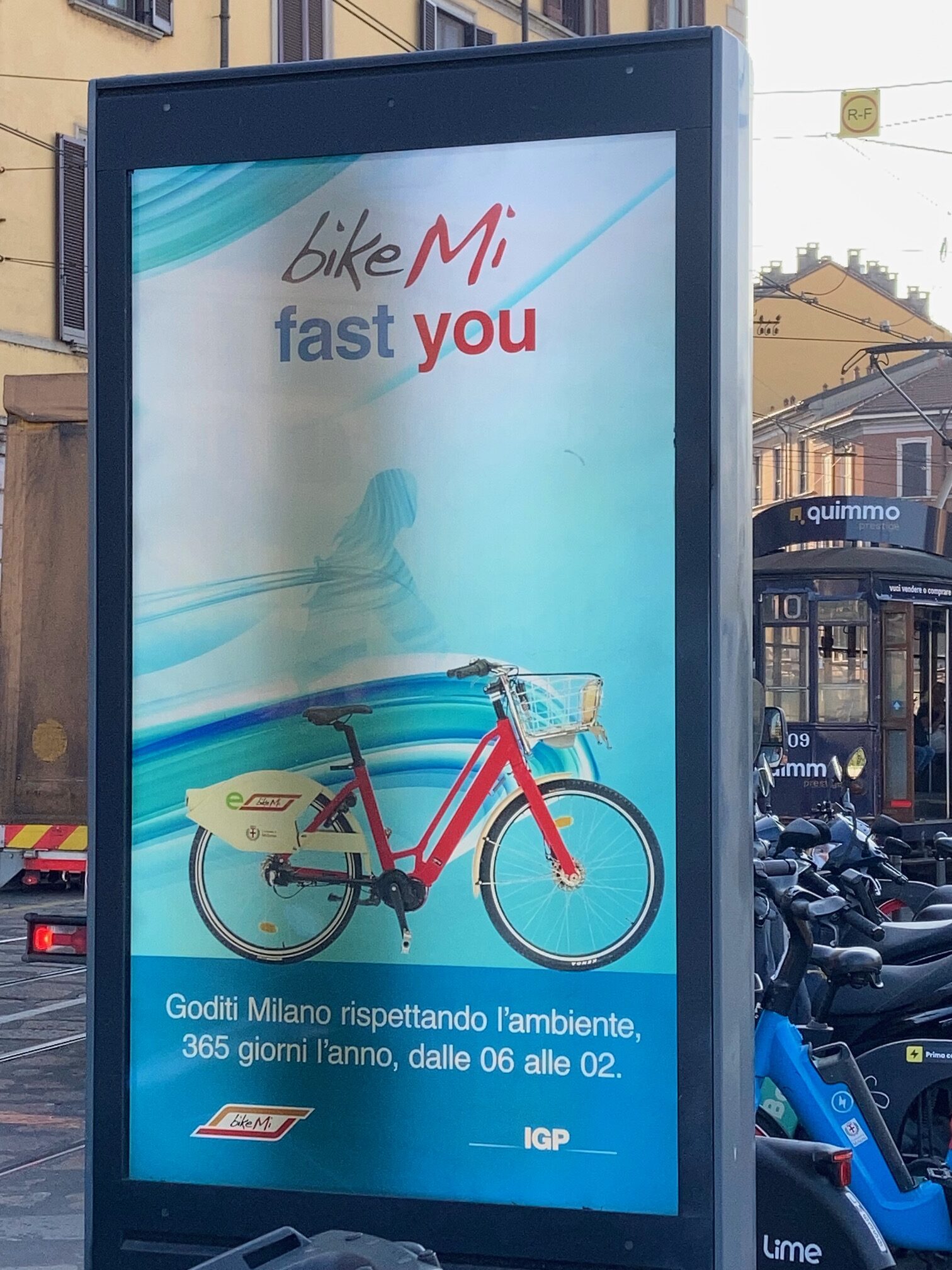 Nella campagna di BikeMi on air in questi giorni a Milano, Bike si tira dietro altri concetti come green, fast, free a cui assegna lo status di verbo, e li fa seguire dal pronome you. E allora nascono Green You, Fast You, Free You. Per un gemellaggio ancora più audace con BikeMi si sarebbe potuto osare trasformare You in Yu, giusto per simpatia, ed avere Green Yu, Fast Yu etc. E magari si poteva anche cucire questo Yu al primo termine, solo per giocare anche nel claim con l’alterazione del pronome, come avvenuto con il nome BikeMi ed avere così FreeYu, FastYu, GreenYu. Ma ricordiamo che una cosa è il claim, figlio di una campagna, che quindi passa, sta e poi se ne va, e una cosa è il nome, che resta resta resta, per sempre.