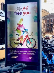BikeMi è un nome di brand di per sé già interessante, che copula (!) con la sillaba Mi. Questa sillaba identifica la città di Milano ma forza anche la particella inglese me, di cui circuisce la forma e rapisce la pronuncia. Mi cioè me, ma anche Milano. Bike è sia il sostantivo “bicicletta” che il verbo “andare in bici, biciclettare, pedalare con la bici”. La costruzione BikeMi rende transitivo il verbo e si può tradurre forzatamente con “bibiclettami” oltre che con “andare in bici per Milano”.