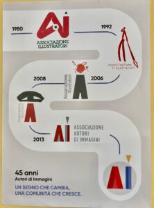 Un manifesto raccoglie i loghi che si sono succeduti negli anni dando anche evidenza ad un evento significativo per chi si occupa di nomi e naming: la sigla AI è rimasta tale nella forma, ma a suo modo è evoluta. Fino ad un certo momento ha rappresentato Associazione Illustratori, dal 2013 è passata ad individuare gli Autori di Immagini. Stesse lettere iniziali A ed I, stessa sequenza, ma con parole e sensi nuovi. La consapevolezza che il termine “illustratori” fosse limitante ad una categoria molto precisa, ha portato i soci a modificare il messaggio aprendo al tema “immagine” e al concetto di “autore”. I professionisti delle immagini sono autori, ovvero “creano un’opera dell’ingegno di carattere creativo in base alla legge n. 633 del 22 Aprile 1941 sul Diritto d’Autore”.