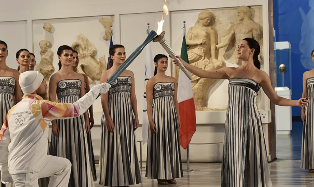 Eccoci ad un punto cruciale: la fiamma e il braciere di Olimpia. Il sacro fuoco viene acceso con un sistema di specchi parabolici che riflettono la luce del sole, in modo che il fuoco sia puro, non creato da mano umana, ma anzi si origini come una manifestazione naturale. Per i giochi Milano-Cortina 2026 la fiamma è stata accesa ad Olimpia il 26 novembre 2025 durante una cerimonia istituzionale, e da lì è partita per il suo lungo viaggio verso la città sede dei giochi.