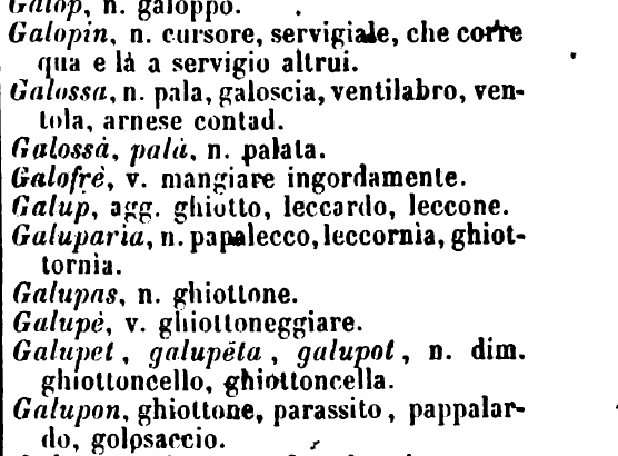 Nel dizionario Piemontese-Italiano Ponza ed. 1844 sono presenti alcune voci curiose. Oltre a galup tradotto con “ghiotto, leccardo, leccone”, c’è galuparia “papalecco, leccornia, ghiottoneria”, galupas e galupon “ghiottone”, mentre galupet, galupeta, galupot sono diminutivi “ghiottoncello, ghiottoncella”, e galupè è il verbo “ghiottoneggiare”.