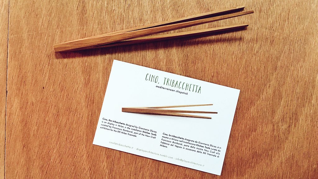 Un po’ maschio e un po’ femmina. Il nome proprio Cino ci spedisce in Cina ispiratrice dell’oggetto (con tripla allitterazione di ci-), mentre il descrittivo Tribacchetta ci porta sul che cosa e sull’uso. È la bacchetta con 3 gambe o stecche o bastoncini, insomma la Tribacchetta. Si usa come posata per mangiare e il fatto di avere 3 gambe in un unico pezzo facilita la tenuta in mano di questo oggetto già di per sé ergonomico, e lo rende anche bello e sofisticato. In legno leggero ma realizzato anche in bambù o materie plastiche, Cino ha un equilibrio favoloso appoggiato su un piano, oltre che in mano.