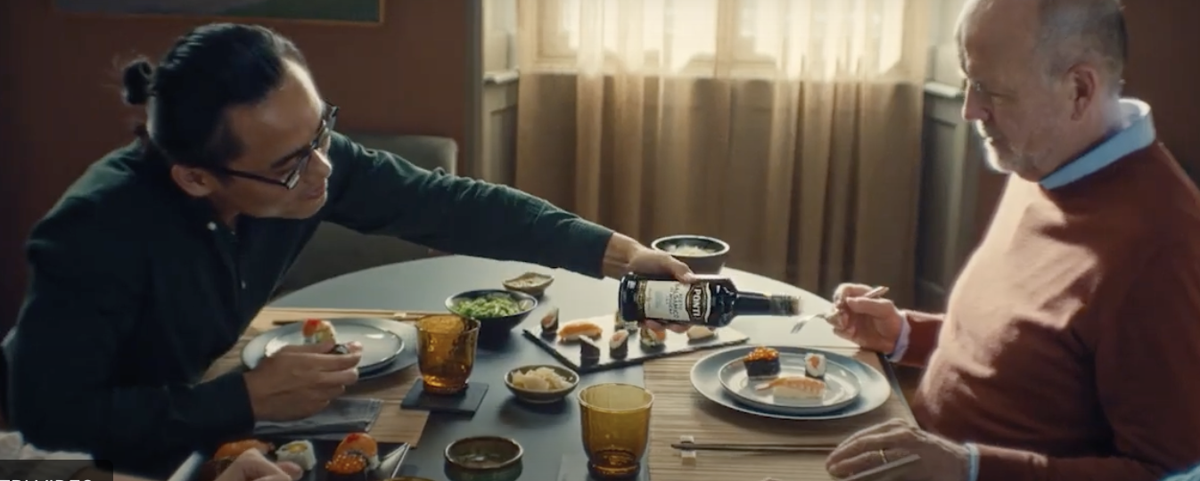 Alla fine dello spot vediamo un giovane orientale che versa gocce di aceto su un boccone di sashimi, strappando un sorriso ad un signore attempato e inizialmente scettico sulle bacchette.