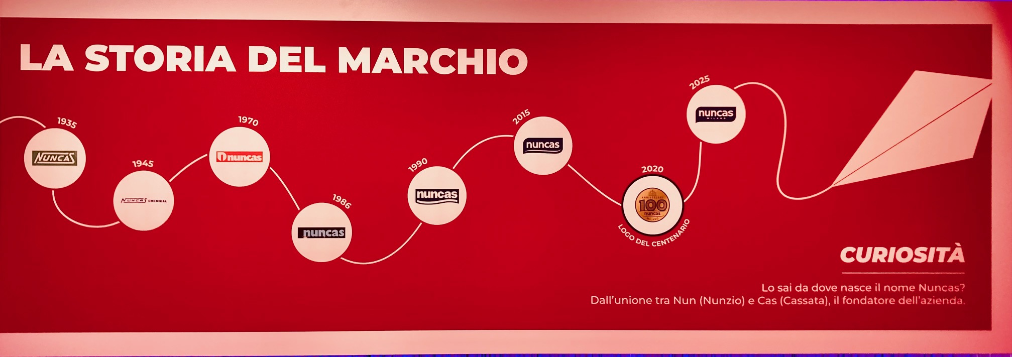 Un poster con un serpentone fa sfilare i loghi Nuncas che si sono succeduti negli anni. Tappe importanti che confluiscono nel recentissimo restyling di marzo 2025 che ha generato una nuova visual identity: il blu di Nuncas fa posto al verde Tiffany. Il nuovo colore del brand oltre alla freschezza intrinseca dichiara con originalità che stiamo entrando in una storia nuova che va oltre la cura della casa. Il nuovo payoff è Home beauty Care: non più solo la casa, ma la bellezza della casa. E nel percorso dell’esposizione si scoprirà che oggi Nuncas è molto di più.